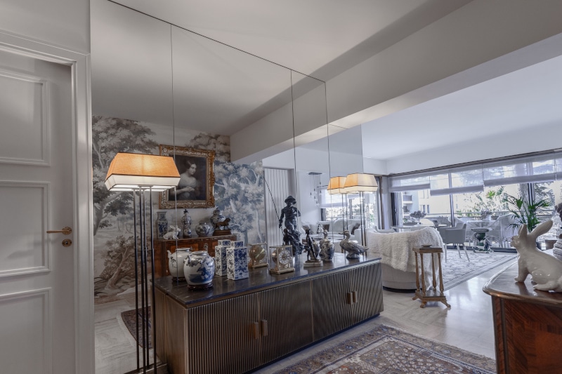 Dans un appartement urbain, l’installation miroir sur une colonne structurelle métamorphose instantanément l’espace, élargit la perspective et reflète subtilement la décoration ou la verdure extérieure.